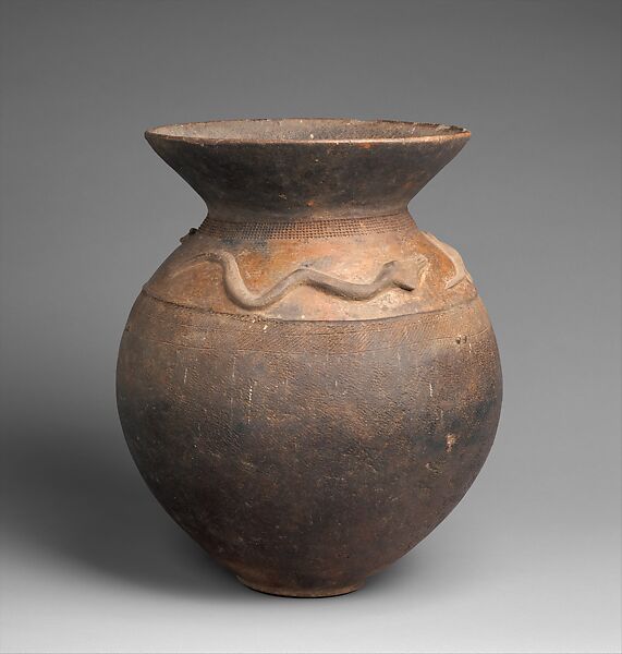 Clay vessels are produced by an artisanal class of Senufo women whose skills are relayed from mother to daughter. This emphasis on generational continuity is further evidenced in the creative process, during which a new vessel is formed over the base of an older version. Designed to store the staple of fermented millet beer, this vessel may have been the property of a diviner. The serpent, turtle, and lizard figures depicted in relief around the shoulder are powerful intermediaries between the human and spirit realms.