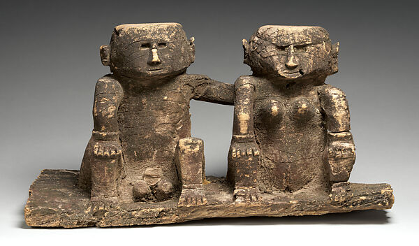 Dieses bemerkenswerte Ahnenpaar des Nage-Volks von der indonesischen Insel Flores stellt wahrscheinlich die Gründer eines der Klans des Dorfes dar. Menschenbilder (Ana deo), die Ahnengeister und andere übernatürliche Wesen zeigten, wurden häufig in Verbindung mit Ahnenschreinen benutzt. Dieses Paar ist wahrscheinlich eine Einzelskulptur, die auch aus zwei Reitern bestehen könnte, die in einem Schrein auf einem Zeremonienpferd gesessen haben könnten, bevor sie von diesem entfernt und als heiliges Objekt verwahrt wurden. Unabhängig vom ursprünglichen Kontext verfügen die Figuren – mit dem Mann, der seine Partnerin zärtlich umarmt – über eine überwältigende stille Würde.