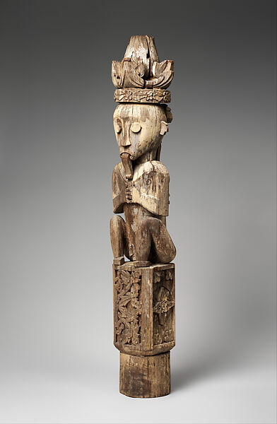 This carved male figure (or hampatong) represents a guardian spirit or recently deceased individual from the Ngadju or Ot Danum people of southern Borneo. The figure is seated with the knees bent and the legs drawn towards the body in a posture typical of this genre of figural sculpture. The arms are flexed at the elbows and point downwards towards the knees, while the hands join at the fingers to rest on the chest. The facial features include highly stylized large circular eyes and an angular nose in high relief. The figure wears an elaborate headdress with a headband adorned with floral motifs and four foliate projections that extend above the head. The headdress itself is crowned with a bulb-shaped form with trailing element which extends down the back of the figure and may represent long hair dressed in an elaborate ‘ponytail’ coiffure. The figure itself sits on a section of carved panels also adorned with floral motifs, completing what would have been the decorative finial of a tall, typically unadorned, post from which it has now been cut away. These figures were erected outdoors, frequently positioned at the entrance to a house in order to ward off malevolent spirits or illness, or placed along paths leading to houses and as a marker of village boundaries. Hampatong that portray protective beings often have a prominently protruding tongue such as this one, which may well be a reference to oratory or speech associated with the animation of their metaphysical aspect.