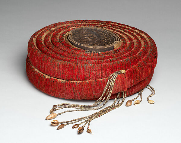 The value of tevau is determined by its size and quality of the red feathers. A tevau of this size would likely contain the feathers of 300 or more birds and have taken hundreds of hours to make. The value of the coils would decline as the feathers weathered and faded so the most valued were those that were vital, red and fresh. A turtle shell charm placed inside this coil further adds to its value. The stings of coix seeds and small shells that are attached to the piece are a marker of time and labor involved in its manufacture, and are placed at the start, end and center point of the coil. For both spiritual and environmental protection, tevau would be stored wrapped in leaves and suspended from the rafters of houses, where the smoke from fires would ward away insects while wooden charms placed in the wrappings protected against malevolent spirits.