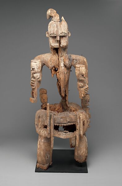 The assertive quality of an iphri force may be cultivated and harnessed by directing prayers and offerings to a personal shrine. The essential visual component of such an altar, prescribed by a diviner to those seeking advantage in conflict, is a four-legged beast with a gaping maw. The dominant human protagonist represents the patron’s spirit double. He is surrounded by a cluster of subsidiary figures under his authority, two of which he grasps in his clenched fists.