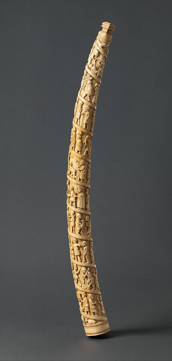 This tusk is one of numerous carved ivories produced by Kongo artists for foreign consumption in the second half of the nineteenth century. The scenes carved in relief portray the brutality of Belgian colonial activities in the Kongo. Chained figures are marched forward by men brandishing rifles. Elsewhere, scenes depict men beaten with knives and the butts of rifles, emphasizing the violent and dehumanizing practices employed by Belgian officials. The portrayal of both slave caravans and ivory porters, many of whom were also enslaved, on this tusk evokes the interdependence between these two commercial endeavors.Vividly illustrating these abuses, this ivory and others like it actively protest against the catastrophes of colonialism by capturing, recording, and circulating these scenes locally and abroad.