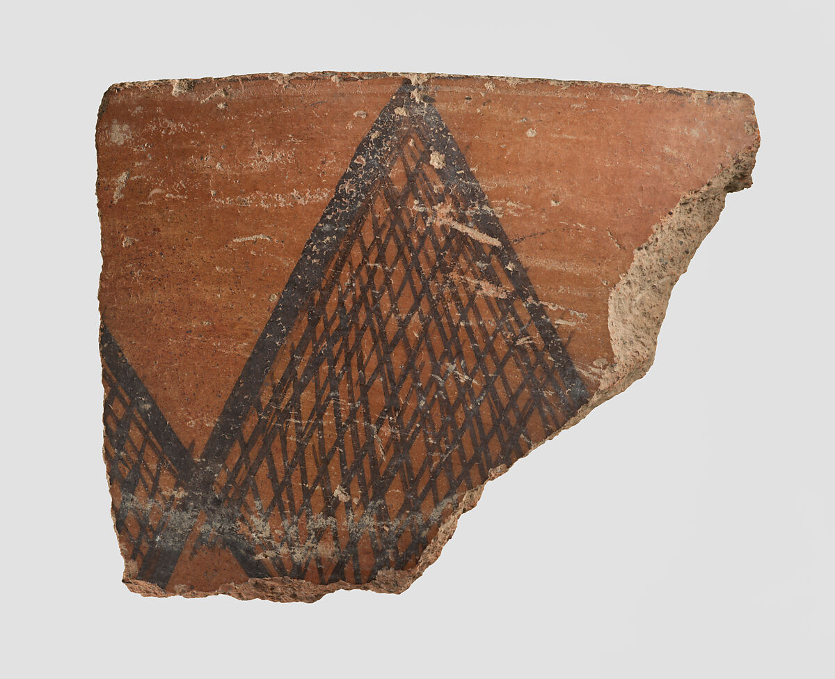 This sherd is made of a red clay, with brown painted decoration. It is typical of Yaz I ceramics from Turkmenistan, dating to ca. 1500-1000 B.C. It was excavated in 1937 at a prehistoric site in the vicinity of Nishapur in northeastern Iran. While Nishapur itself was founded by the Sasanian king Shapur I (reigned ca. A.D. 241-272), this sherd shows that human habitation there goes back to the prehistoric period. Furthermore, the prehistoric pottery from Nishapur has close affinities with ceramic materials from Central Asia rather than with contemporary sites in Iran, meaning that in this period its inhabitants were likely culturally linked to their neighbors to the east. At the same time, Nishapur’s location on what later became known as the Great Khorasan Road suggests that it was part of the trade network that facilitated the import of precious stones such as lapis lazuli, carnelian and turquoise from Central Asia to Mesopotamia.
