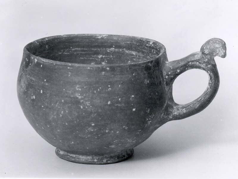 This cup is shaped like a modern teacup. It has rounded sides and a concave base on a ring. A loop handle with a tab for the thumb is attached to the body on one side. The cup is made of grey clay and has been burnished. Wheel lines on the interior indicate that it was made on a potter’s wheel.