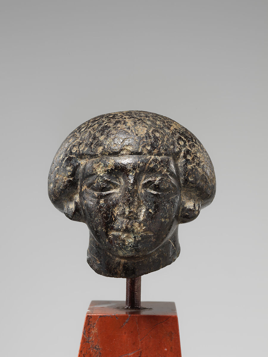 This head comes from a small figure that can be identified as a man of Nubian descent based on the distinctive ring shapes incised onto the hair. It is uncertain if the statue was intended to depict an actual person, represent a general ethnic type, or belonged to a magical/execration figurine. Throughout the Middle Kingdom, members of Nubian ethnic groups were depicted on relief, paintings, and stelae as members of Egyptian society, as well as captives and supplicants, but they did not often appear on sculpture with identifying physical characteristics. If this head belonged to a representation of a living person, he must have been a mid-level member of Egyptian society who was able to commission a modest but lively statue that reflected his desire to proudly commemorate his ethnic origins.