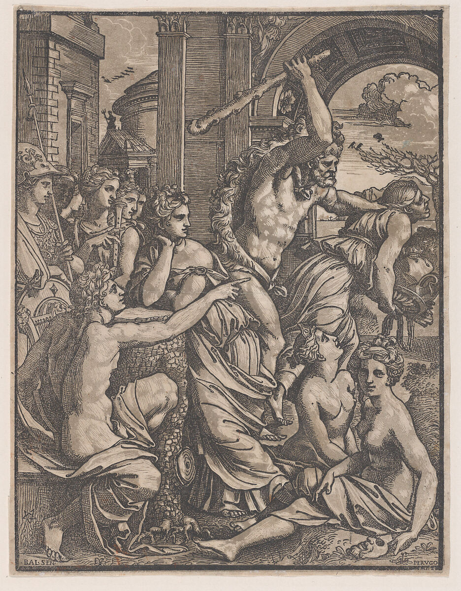 The drawings of Peruzzi were often engraved by the Master of the Die. In this case, he collaborated with Ugo da Carpi. Ugo da Carpi was an important early practitioner of the multiblock colored woodcut, a technique known as chiaroscuro (literally, 'light-dark'), which he falsely claimed to have invented. This method of printmaking requires the successive printing of two or more blocks. In this case, the line block (a block of wood from which everything has been cut away except the outline) prints the lines and areas of darkest shadow, and a second block prints the areas of mid-tone. The unprinted areas, where the white of the paper is visible, read as highlights in an image that resembles a wash drawing.