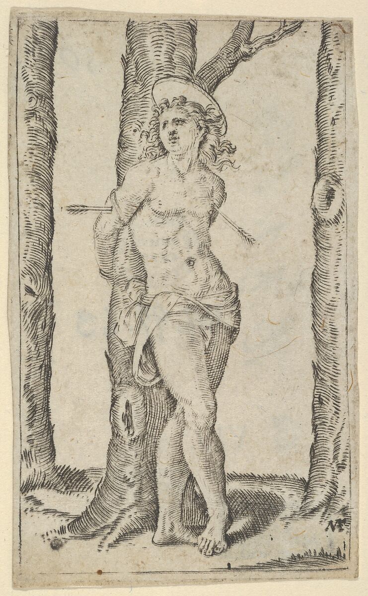 Saint Sebastian tied to tree pierced with arrows, from "Piccoli Santi" (Small Saints)