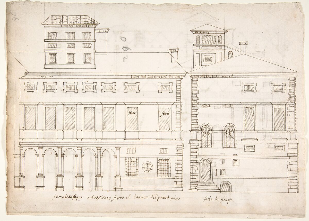• Title: Palazzo Salviati-Adimari elevations (recto) Villa Farnesina stables, plan and section; drawing of a screw (verso)