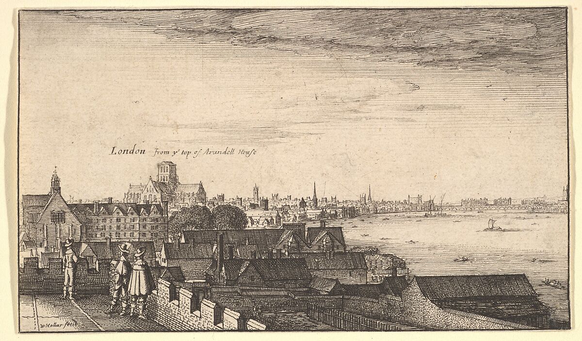Three men wearing broad-brimmed hats, one wearing cloak, standing on top of the battlemented roof of Arundel House, see from behind; St Paul's and the buildings of the Temple seen in distance among roofs, with boats in the Thames on the right.