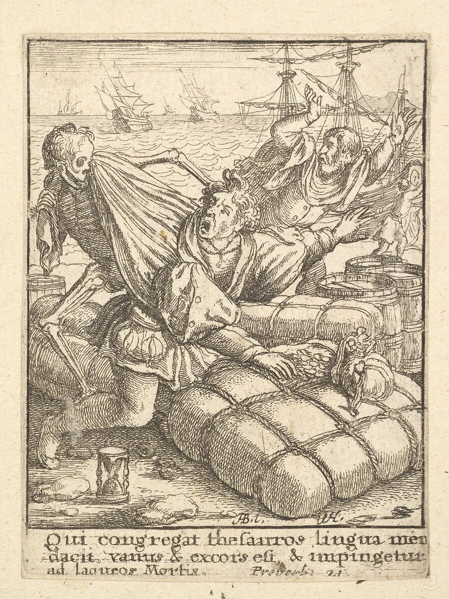 Death drags one of them away, to the left, from the pile of coins he is counting.
