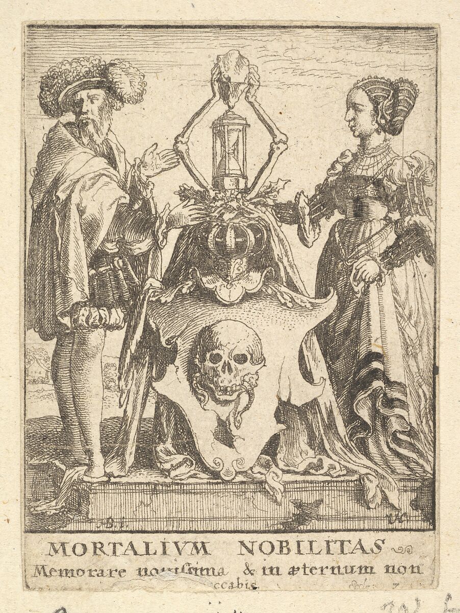 A noble couple steady a shield on which a death's head, surmounted by by a helm, mantle and a crest with an hour-glass and two arms bones holding a piece of a skull aloft.