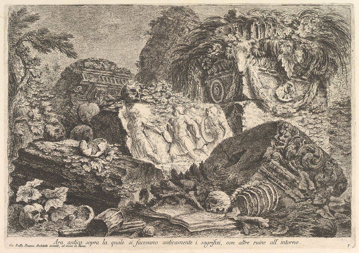 - Title: Ancient Altar on which sacrifices were performed in antiquity, surrounded by other ruins (Ara antica sopra la quale si facevano anticamente i sagrifizi, con altre ruine all'intorno), from "Prima Parte di Architettura, e Prospettive"
