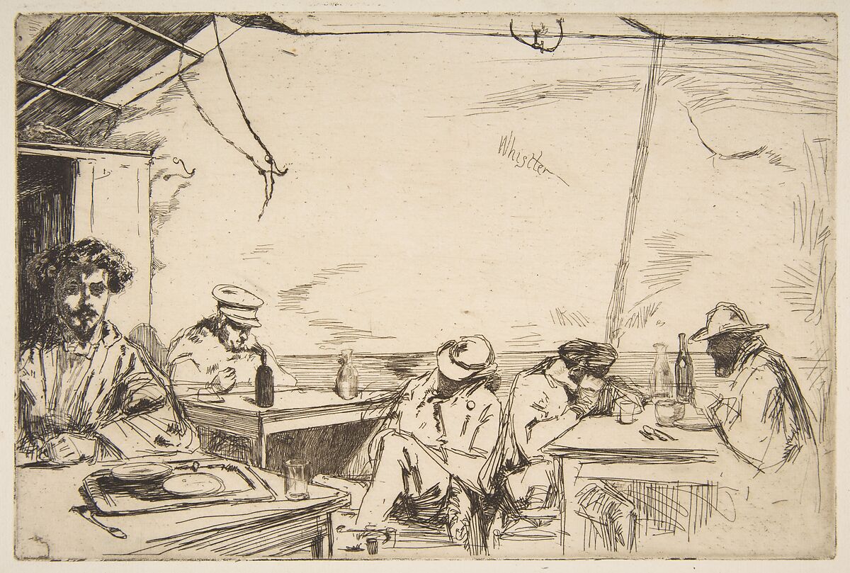 The title of this print translates as soup for three pennies and indicates that the men shown sit in a cheap café or bar (notes left by Whistler suggest it is the Café des Pieds-Humides ('Café of the Wet Feet') in Paris). Soon after making this etching, Whistler moved to London, took lodgings south of Tower Bridge, then recorded a similar scene in an etching titled "Longshore Men"). Black bottles on the tables here, near men who slouch or sleep, evoke the addictive properties of alcohol and the signature, etched at upper center on an otherwise unadorned wall, reads like a fragment of graphiti.