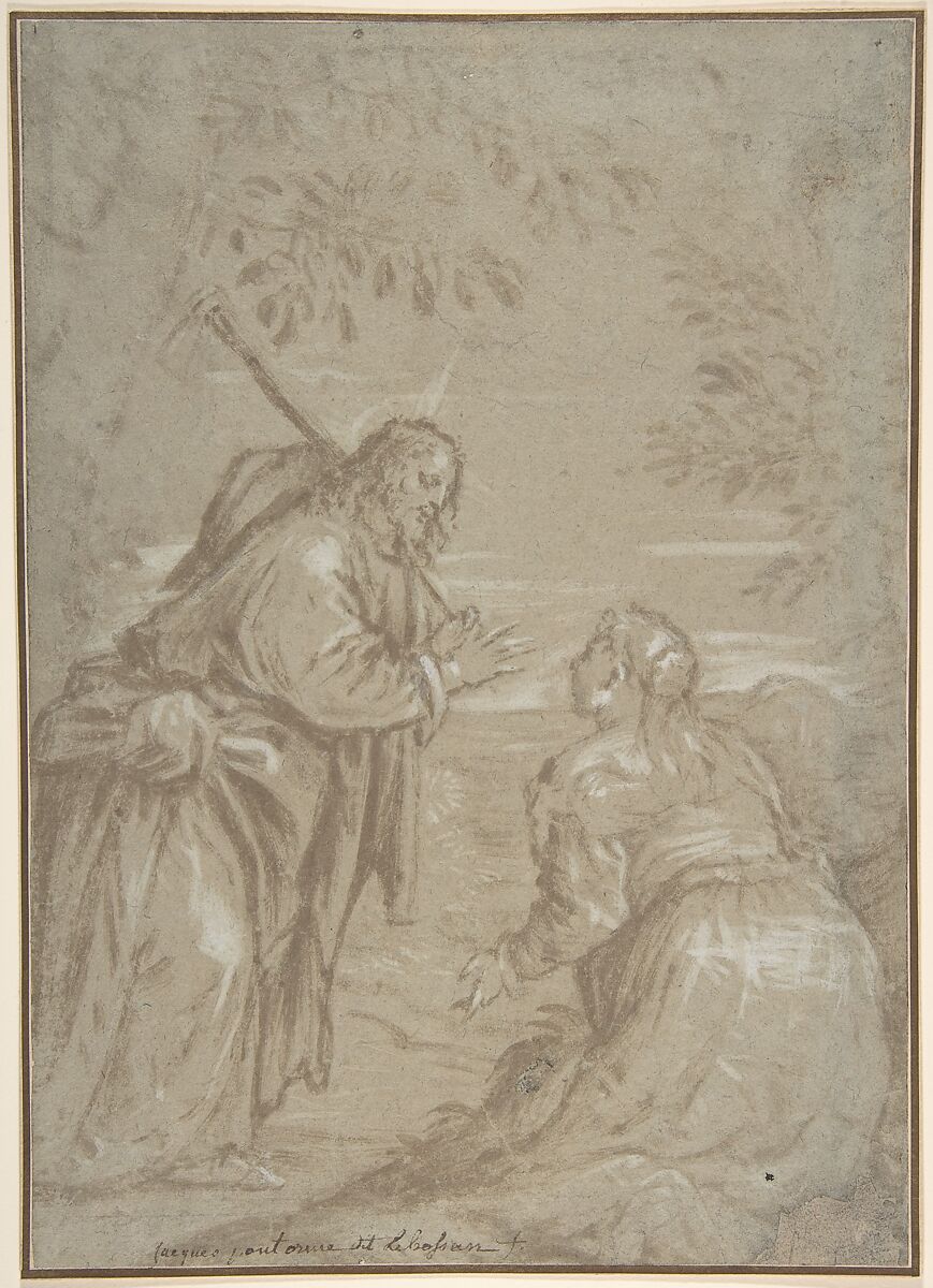 In this expressively pictorial composition of the "Noli me tangere" (John 20:14-18), done quickly with the brush and brown wash with white gouache highlights, the resurrected Christ, in the guise of a gardener, stands at left before the kneeling Saint Mary Magdalen on the right, who is seen from behind. The present sheet, acquired in 2008, marks a new addition to Jacopo Bassano's oeuvre, who is best known for his innovative pastel drawings.