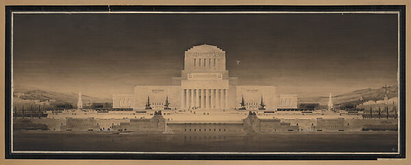 This drawing is part of a group of drawings donated to the Museum by the National Institute for Architectural Education (now the Van Alen Institute). The institute was founded in 1894 as the Society of Beaux-Arts Architects by a group of alumni from the École des Beaux-Arts in Paris to promote and advance architectural practice in the United States of America. Alongside a series of courses, the Society initiated various competitions and awards, of which the so-called Paris Prize, first awarded in 1904, was the most prestigious. The winner of the annual competition was given the opportunity to study at the École in Paris for a year. With the exception of the war years, from 1915 to 1918 and 1941 to 1946, the prize was awarded annually up until 1995. The Met collection holdings contain 78 prize-winning designs for public buildings, monuments and urban planning by 24 architects from the period between 1907 and 1947.