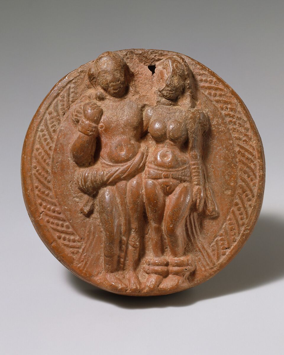 Depictions of loving couples are ubiquitous in early Indian art, occurring in stupa gateways and rock-cut shrines. Although their specific meaning is obscure, they are interpreted as an auspicious life-affirming presence. Another disk, perhaps from the same mold, was excavated at the early urban center of Sonkh, in Mathura, the Kushan-era capital of north India.