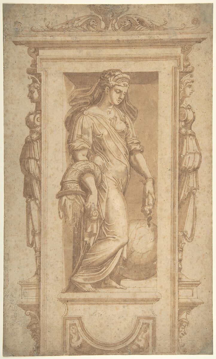 This bold, elegantly finished drawing is a careful copy after the Allegorical figure of the virtue Goodness, entitled "Benignitas," in the fresco by Giorgio Vasari that adorns a wall of the Sala dei Cento Giorni in the Palazzo della Cancelleria in Rome. Vasari painted this large reception hall in 100 days (hence the name of the room) for Cardinal Ranuccio Farnese in 1546, and relied on the heavy collaboration of assistants. The allegorical figure in the fresco is meant to represent a sculpture, painted therefore in monochrome. This drawing had been previously attributed to the circle of Francesco Salviati by Philip Pouncey (his note on the mount of the drawing, April 1965), before the connection to Vasari's fresco had come to light. Pouncey's preliminary suggestion of attribution was a reasonable hypothesis, given the artistic reciprocities between Vasari and Salviati in the 1540s when both artists were in Rome. Pouncey had also noted the close resemblances of the drawing with Polidoro da Caravaggio's manner of designing the pattern of folds in the draperies. The watermark (Woodward "Arrows crossed C", Venice 1567) establishes a date around 1567.