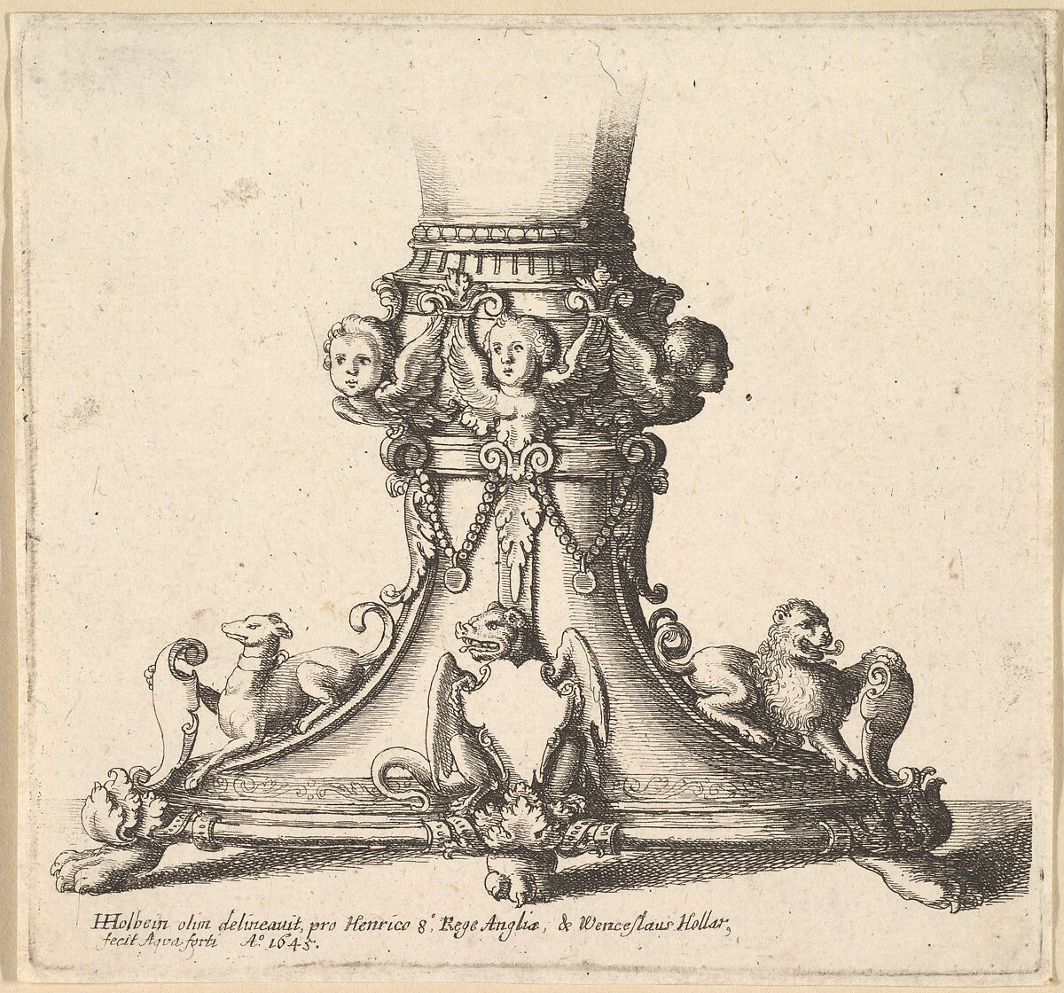 Base of an ornate cup, featuring three putti and three animals holding shields. greyhound at left, dragon at centre, lion at right; cup partly erased above; after Hans Holbein