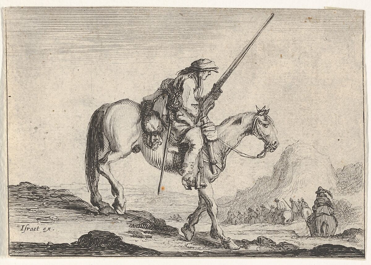 - Title: Plate 12: A soldier on horseback, holding a musket in his right hand, in profile descending a slope towards the right, other soldiers on horseback to right in the background, from "Various Figures" (Agréable diversité de figures)