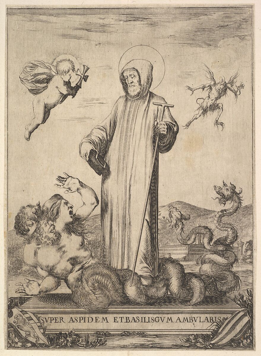- Title: Saint Jean Gualbert trampling a monster with two human heads and a serpentine body, from "Frontispiece and four scenes from the life of Saint John Gualbert" (Frontispice et quatre vignettes pour une vie de Saint Jean Gualbert)