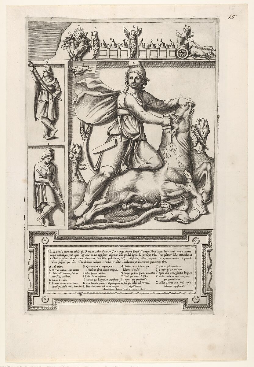 - Title: Relief with Mithras kneeling upon a bull and driving a sword into its shoulder, at left two smaller standing figures, one holding a sheathed sword and one holding a sword, a frieze with chariots and serpents coiled around figures above