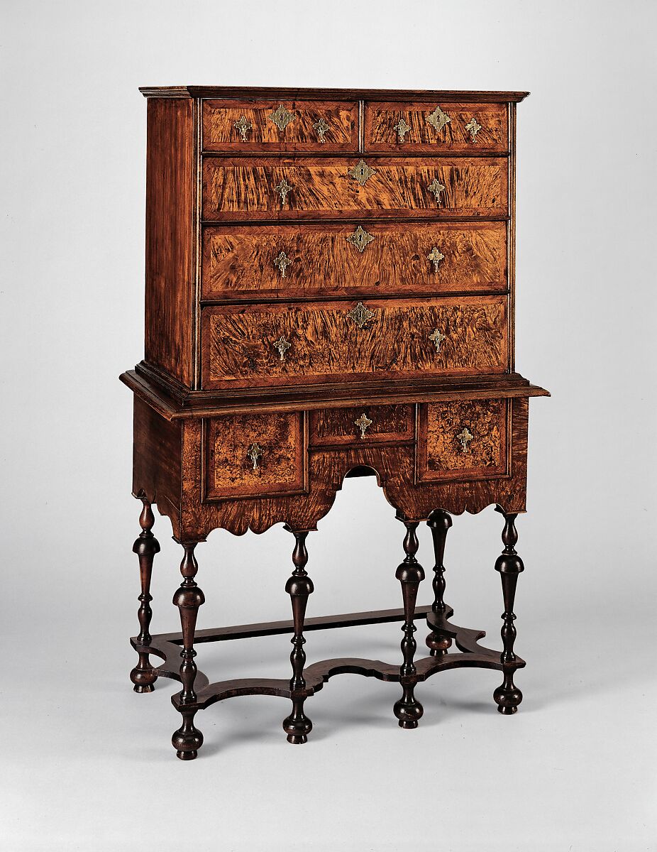 A new form introduced with the William and Mary style, the high chest of drawers was a prestigious addition to the early-eighteenth-century home. The scalloped skirt, curved stretchers, and six turned legs on this chest bring lightness and movement to the form. The large, smooth surfaces of the drawer fronts of the upper and lower cases were achieved by abandoning the panel-and-frame tradition in favor of dovetailed-board construction—a technique created by the new craft of cabinetmaking. Dramatic surface decoration, accomplished here by bordering the richly figured walnut-veneered drawer fronts with a herringbone pattern, is characteristic of furniture dating from the 1690s to the 1730s.
