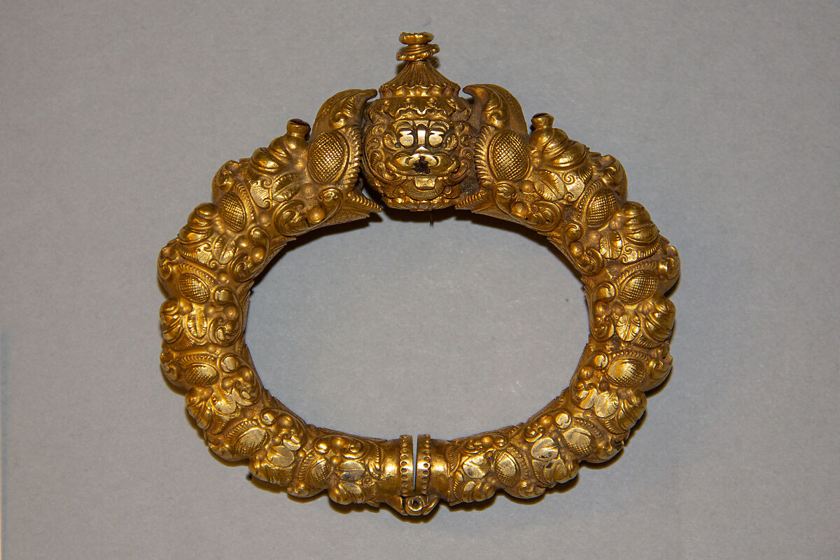 Bracelets decorated with confronting animal heads are known from various cultures since antiquity. In India, the terminals of bracelets or anklets are commonly ornamented with makara heads. The makara is a mythic water monster which combines the features of a crocodile, elephant, and fish and is believed to be a protective form. Here, two confronting makara heads hold in their jaws a round object that has been variously interpreted as magical jewel or a stylized rudraksha bead, sacred to the god Shiva.
