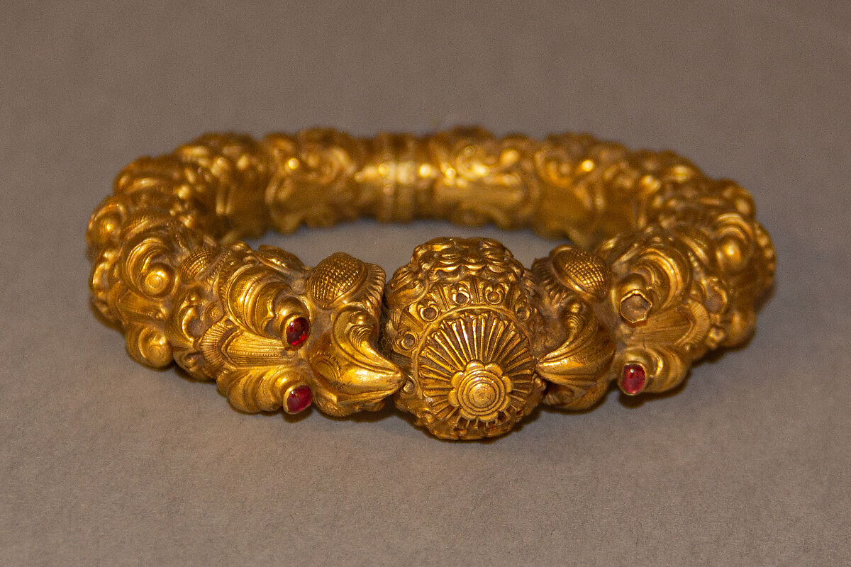 Bracelets decorated with confronting animal heads are known from various cultures since antiquity. In India, the terminals of bracelets or anklets are commonly ornamented with makara heads. The makara is a mythic water monster which combines the features of a crocodile, elephant, and fish and is believed to be a protective form. Here, two confronting makara heads hold in their jaws a round object that has been variously interpreted as magical jewel or a stylized rudraksha bead, sacred to the god Shiva.
