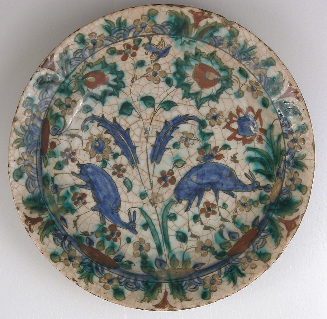 - Medium: Stonepaste; underglaze painted in black, blue, and green with red and yellow slips
