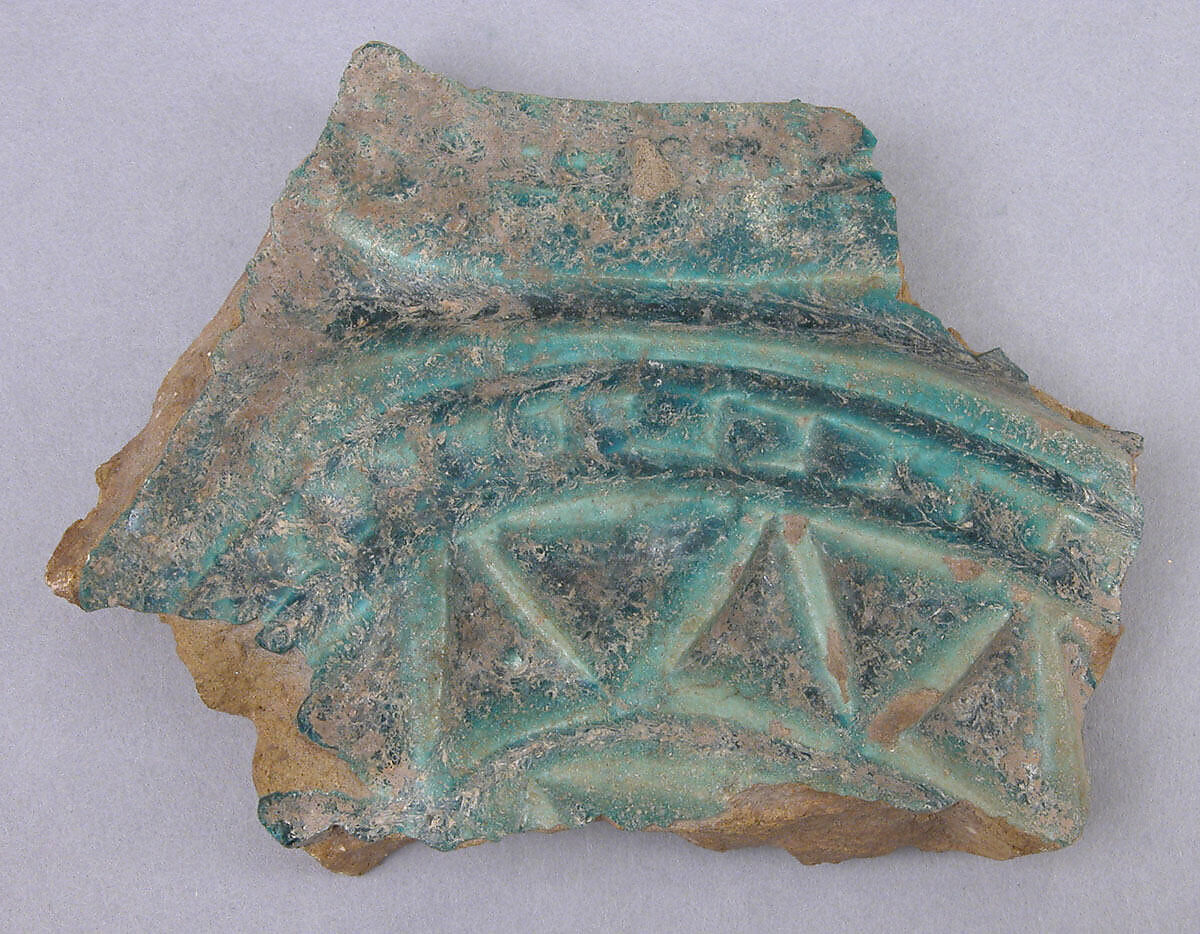Finds like this fragment attest to the patterns of continuity and change in material culture between the late Sasanian and the early Islamic period. This fragment shows deeply excised triangles framed by a beaded band. Both motifs are found on late antique and Sasanian period ceramics, but the green glaze here suggests a later period. The beaded band is a versatile and enduring motif, found on a variety of mediums such as textiles and metalwork, as well as architectural decoration in stucco, wood, and stone. Its use on Byzantine textiles, traded throughout the Mediterranean, may explain its appearance in medieval South Italian art.