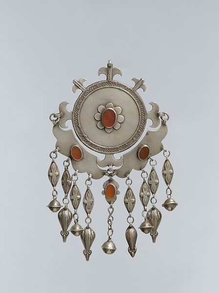 - Medium: Silver, with decorative wire, embossed pendants, ram's-head terminals, loop-in-loop chains, conical bells, and table-cut carnelians