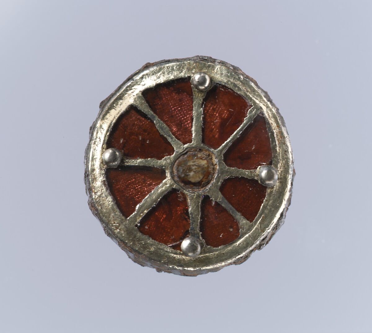 Garnets, worked in the cloisonné technique, featured prominently in the luxury jewelry of the Franks. Jewelers would solder small compartments arranged in geometric patterns onto the surface of a metal disk. In those cells, or cloisons, they would place a textured piece of gold foil, which would show through the thin translucent garnet that would then be set on top.