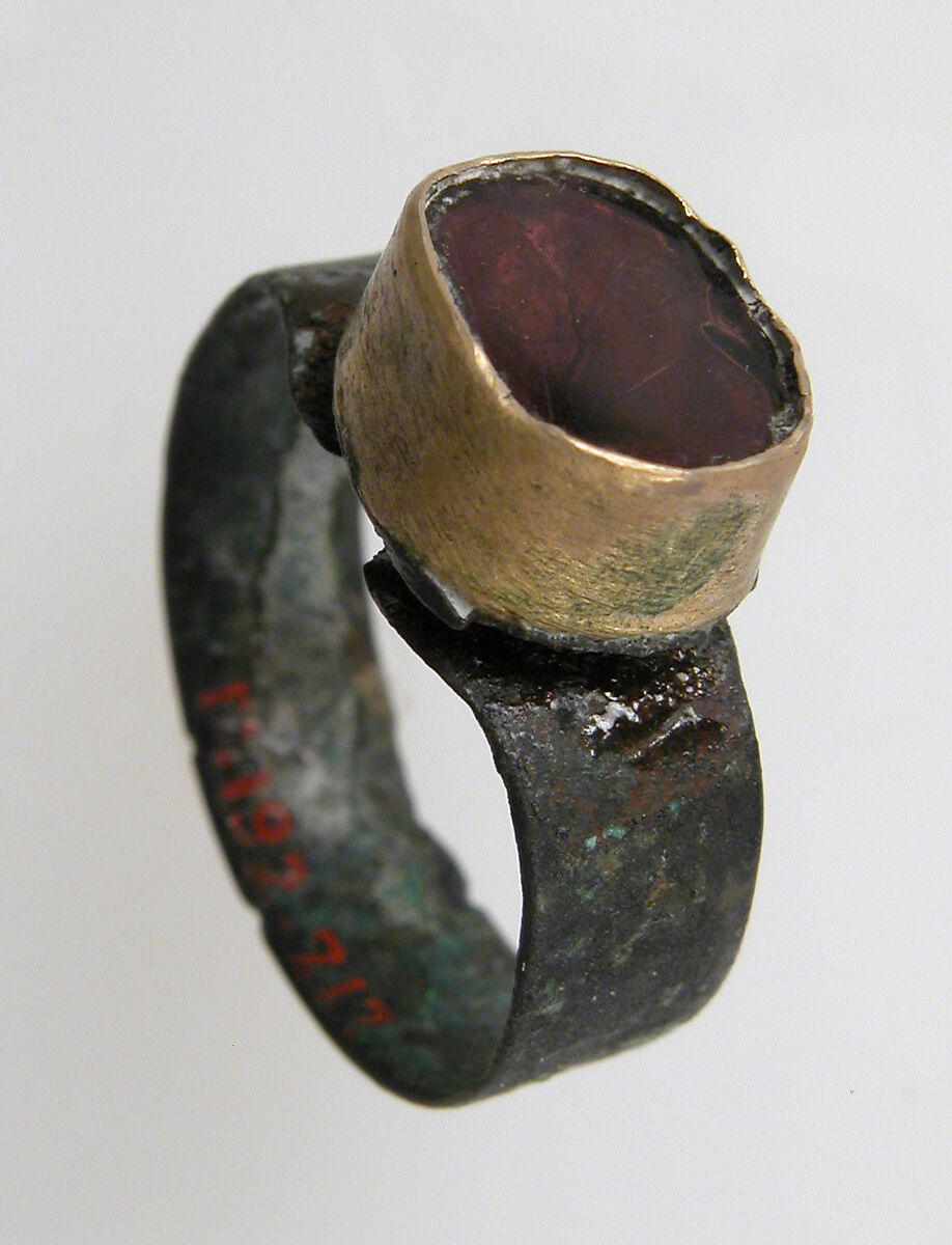 - Medium: Silver, gold bezel, glass paste or carnelian(?)