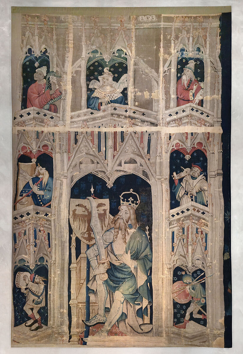 Dieses Stück gehört zu den frühesten und schönsten mittelalterlichen Wandteppichen und war Teil eines Ensembles, das neun Helden gedachte: drei aus der jüdischen Tradition, drei aus der heidnischen Antike und drei aus der christlichen Welt. Hier trägt Julius Caesar eine offene Kaiserkrone und der doppelköpfige Reichsadler hängt von seinem Thron. Musiker und Hoffiguren umgeben ihn; der dunkelhäutige Mann oben links könnte Caesars afrikanische Ländereien symbolisieren. Sowohl Weisheit als auch Tapferkeit repräsentierend wurden die Neun Helden zuerst in einem französischen Gedicht aus dem frühen 14. Jhd. erwähnt: „Die Schwüre des Pfaus". Die Neun Helden der Cloisters Collection haben vermutlich Jean de France, dem Herzog von Berry gehört, einem anerkannten Mäzen.