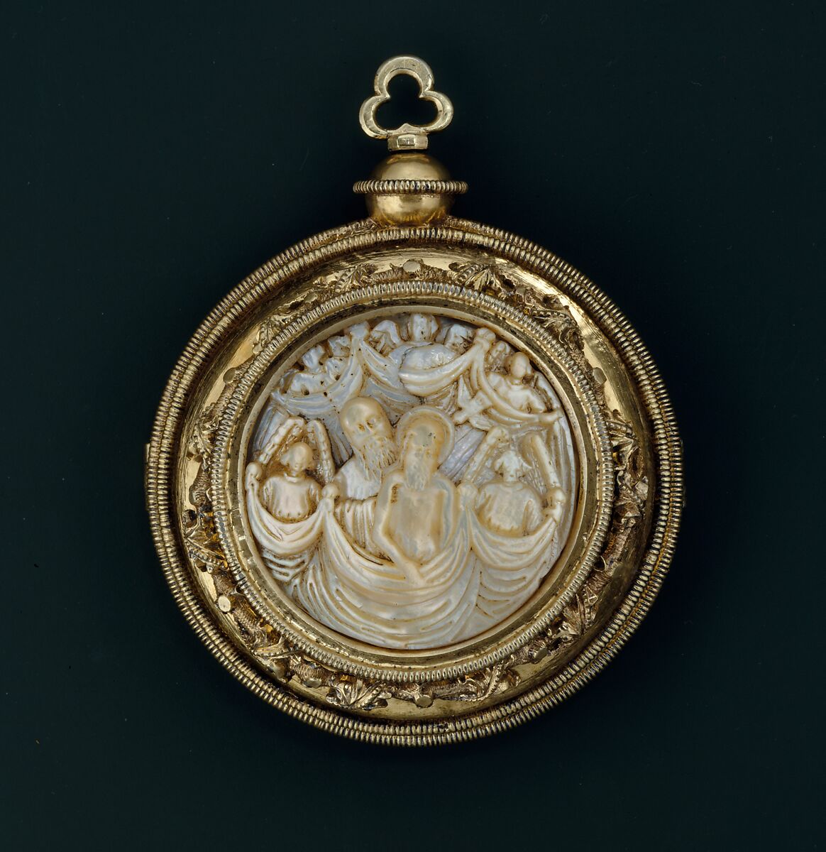 Worn as a pendant, the osculatory was kissed by the celebrant of the Mass at the mingling of the bread and wine to signify the unity of the Church through the bond of charity. The plaque on the front represents the Trinity and refers to the Redemption of man through Christ's sacrifice on the cross. Engraved on the back plate are SS. Ursula and Barbara. A number of other objects in The Cloisters Treasury, including the silver and mother-of-pearl tabernacle, also come from the treasury of St. Peter's monastery in Salzburg.