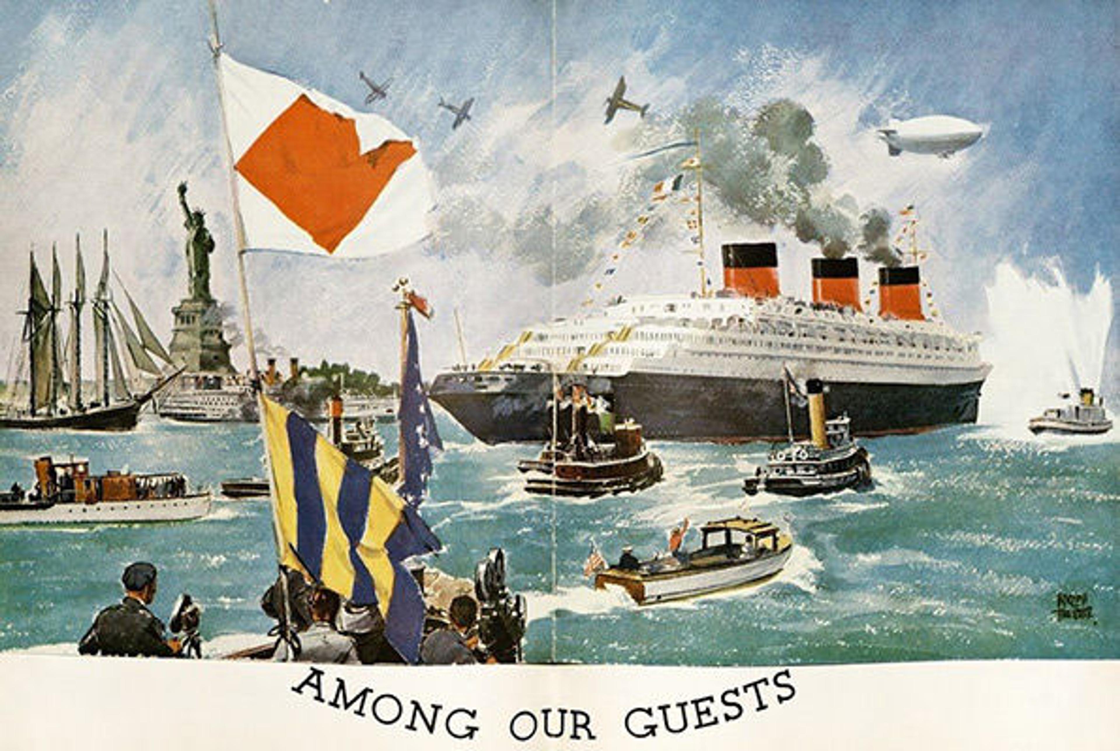 Der Ozeandampfer Normandie war der letzte große Ausdruck der französischen Art-Deco-Mode. Dieses Wandgemälde war eines von vieren, die für den Salon der Ersten Klasse angefertigt wurden. Die Geschichte der Navigation ist nominell sein Motiv; die Fülle an quasi historischen Gefährten und sagenhaften Kreaturen sollte eindeutig keine Geschichte erzählen, sondern einen rein dekorativen Effekt erzeugen. Die Passagiere der Normandie zahlten weniger für den Transport als vielmehr für Atmosphäre und der Salon war ein Tempel des Glamours. Die spiegelhafte Brillanz entstammt der Verre-Églomisé-Technik: Die Dekoration wurde auf die Rückseite der Glastafeln aufgetragen, die dann mit ihren Vorderseiten in den Raum blickend befestigt wurden.