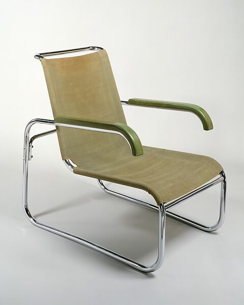 Following the success of his "Wassily" chair, Breuer continued to experiment with tubular steel furniture. He partnered with the German manufacturer Thonet, designing a number of chairs, stools, and ottomans made from this lightweight, traditionally industrial material. In the "B35" armchair, Breuer employed seemingly continuous steel runners as the chair's frame. The seat and back were upholstered in simple canvas, and the armrests padded with lacquered wood. Both the seat and armrests are dramatically cantilevered without vertical supports, emphasizing both the tensile strength and the slenderness of the tubular steel construction. Like Breuer's "Wassily" chair, the "B35" was not a direct product of the Bauhaus; it does, however, clearly conform to Bauhaus principles of design and construction, with its modern, stripped-down form made from industrial materials not typically used in furniture at this time.