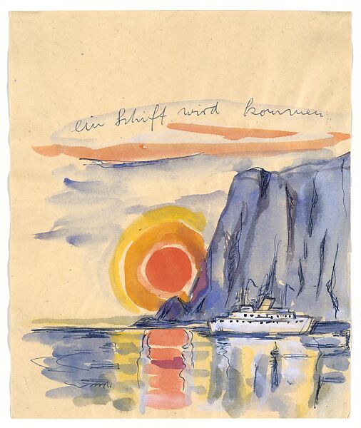 In summer 1974 Kiefer traveled to the northernmost region of Norway, the North Cape, on the Arctic Ocean, taking Polaroids and collecting postcards of the stunning landscape for later use in the studio. Here, an image of a cruise ship against the backdrop of a magnificent fjord and the glowing midnight sun becomes the personification of, in Kiefer's words, the "perfect kitsch song of the student revolution" of the 1960s—"A Ship Will Come"—which was popular in the Germany of Kiefer's youth and, for the artist, full of unrealized, even vulgar, utopian yearning.