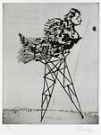 Kentridge developed this group of prints in tandem with a theater work of the same title, both inspired by Italian writer Italo Svevo’s masterpiece of solipsistic fiction Confessions of Zeno (1923). Svevo’s novel is written as the first-person journal entries of a narcissistic, middle-aged hypochondriac from Trieste named Zeno Cosini, who is telling his story at a psychotherapist’s request. For Zeno at 4a.m., Kentridge in part appropriates Zeno’s paranoid history as his own, and many of the objects represented in this suite of prints—the telephone, the transmission tower, the shower—are frequent protagonists throughout the artist’s projects.