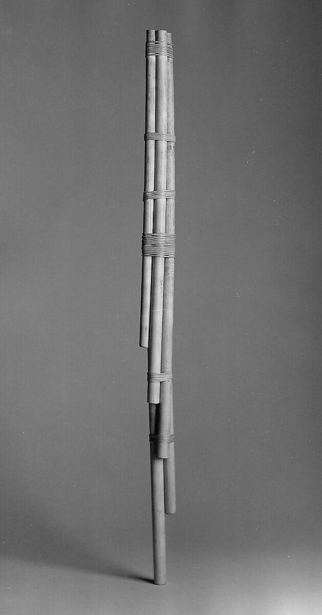 Consisting of groups of small, end-blown bamboo flutes, each with a different pitch and bound together to form a single instrument, panpipes occur predominantly in the southwest Pacific. They are made in two basic forms: raft panpipes, in which the canes are arranged side by side in a single or double row like logs on a raft, and bundle panpipes, in which the canes are bound in a circular cluster.