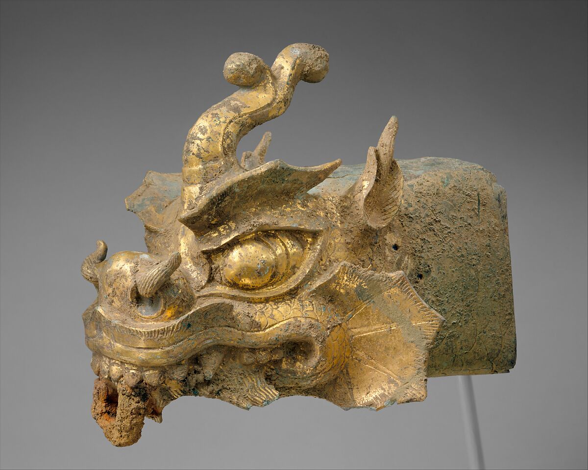 This finial in the shape of a dragon’s head would originally have been attached to a corner rafter of a royal hall or a Buddhist temple building.The beast’s bulging eyes, flaring nostrils, and elaborate scales convey the fierceness and invincibility of this auspicious creature. The small holes at the sides of the neck were probably used to secure the heavy object to the roof. The bell, which functioned as a wind chime, once had a metal-plate clapper inside. The bell would have been suspended from the loop at the mouth of the dragon by a hook. The decorative panels on the lower halves of both faces of the bell feature a swastika (an ancient symbol associated with the Buddha) within a lotus-flower platform. A nearly identical set of a dragon’s head and wind chime, the only other comparable extant example, is in the collection of the Leeum Museum of Art in Seoul.
