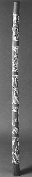 The yidaki, a form of the didjeridu, is played by indigenous Australians by buzzing their lips into its long tube, creating a low-pitched drone. This example was decorated by the contemporary artist Nonggirrnga Marawili using geometric patterns associated with the Djapu clan of her husband.