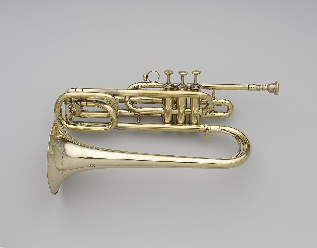 Patented in 1847, this cornet has Périnet valves and can be made playable in the keys of B-flat, A, A-flat, G, F, E, E-flat, and D by pulling out the slide, turning the valve, or doing a combination of both. The invention made it possible to avoid exchanging independent extension tubes to effect a change of key.