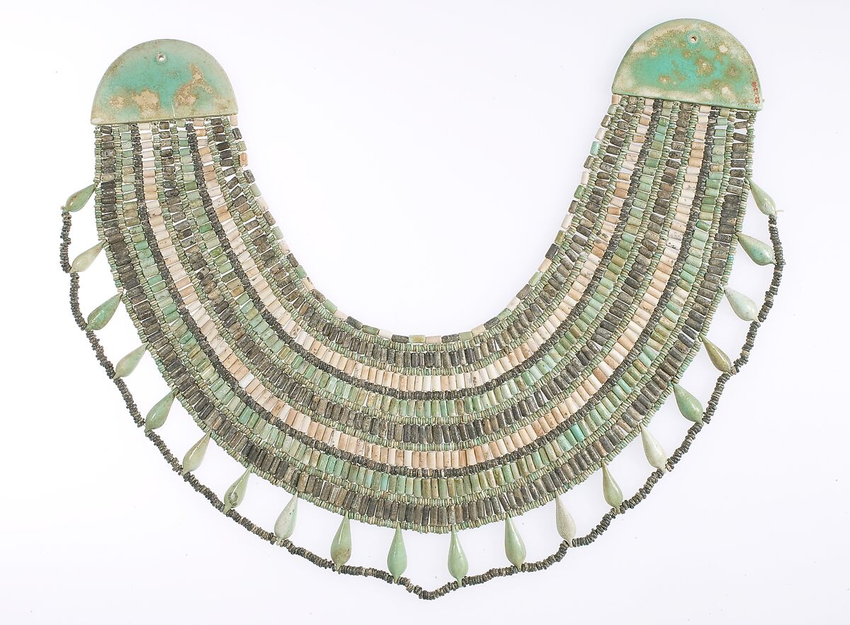 This piece of jewelry is a broad collar, a type of multi-strand necklace that covers the wearer’s upper chest and shoulders. Broad collars were popular from the Old Kingdom on and the piece here represents a conventional type that is composed of beads and semicircular terminals (endpieces). It features seven alternately colored rows of vertically placed cylindrical beads, separated by rows of small disk beads. At the bottom are differently shaped elements, so called drop beads.