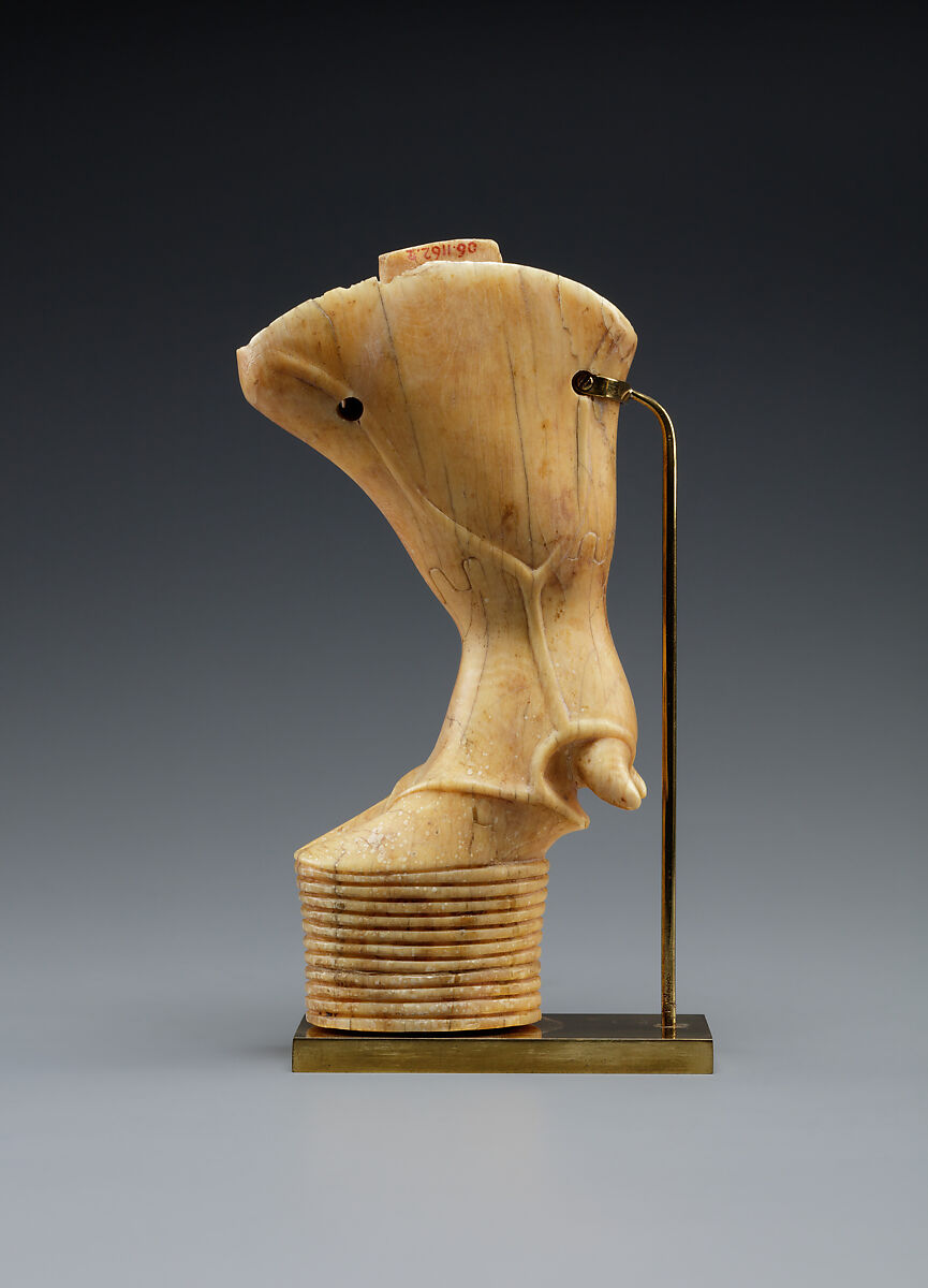 Chairs and beds belonging to the elite sometimes stood on legs that emulated the lower limbs of lions or bulls. The example seen here is modeled after the hind leg of a bull.