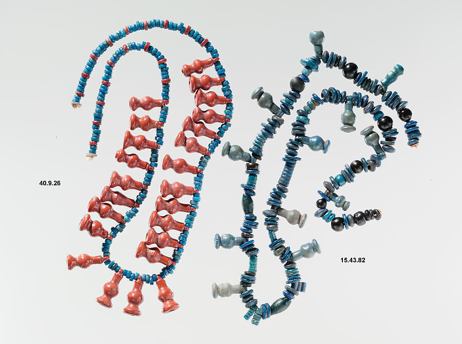 A large group of New Kingdom bead types are based on flowers or their buds. These elements are found in single strands of beads as well as broad collars, although flowers as components of broad collars seem to be most common after Hatshepsust's time. Two of the most popular floral beads depict the buds of poppies and of cornflowers. Both were staples of the Egyptian garden and were used to fashion fresh bouquets for shrines and floral broad collars. Because the buds of these flowers have a similar shape, it is sometimes difficult to be sure which one is represented.