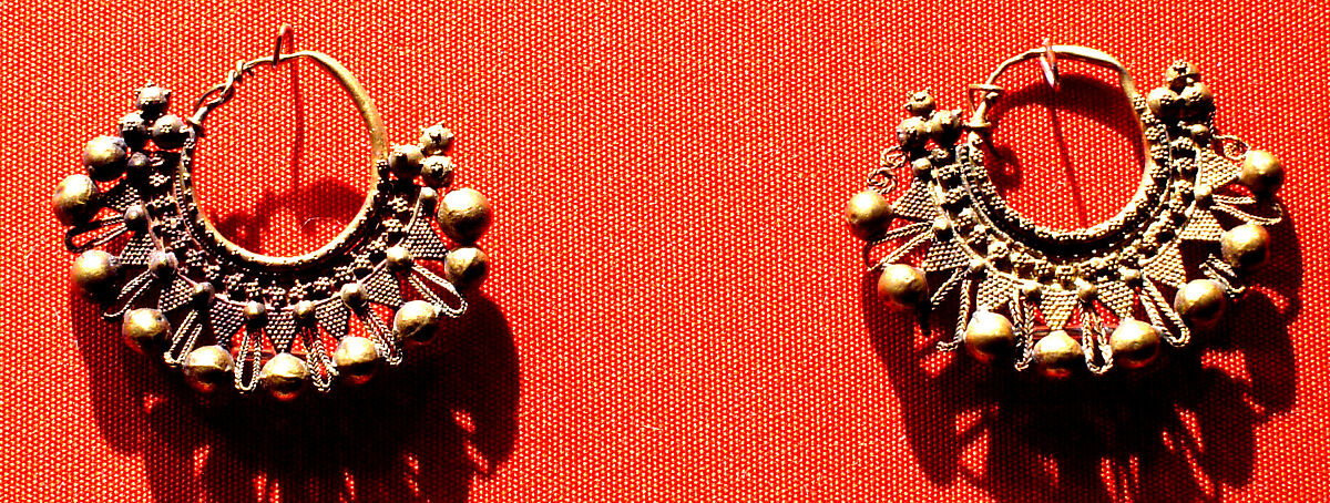 Earrings consisting of a hoop with a crescent-shaped array of granulated triangles and additional filagree and granulation are known from Egypt and Syria and considered mid to late Roman.