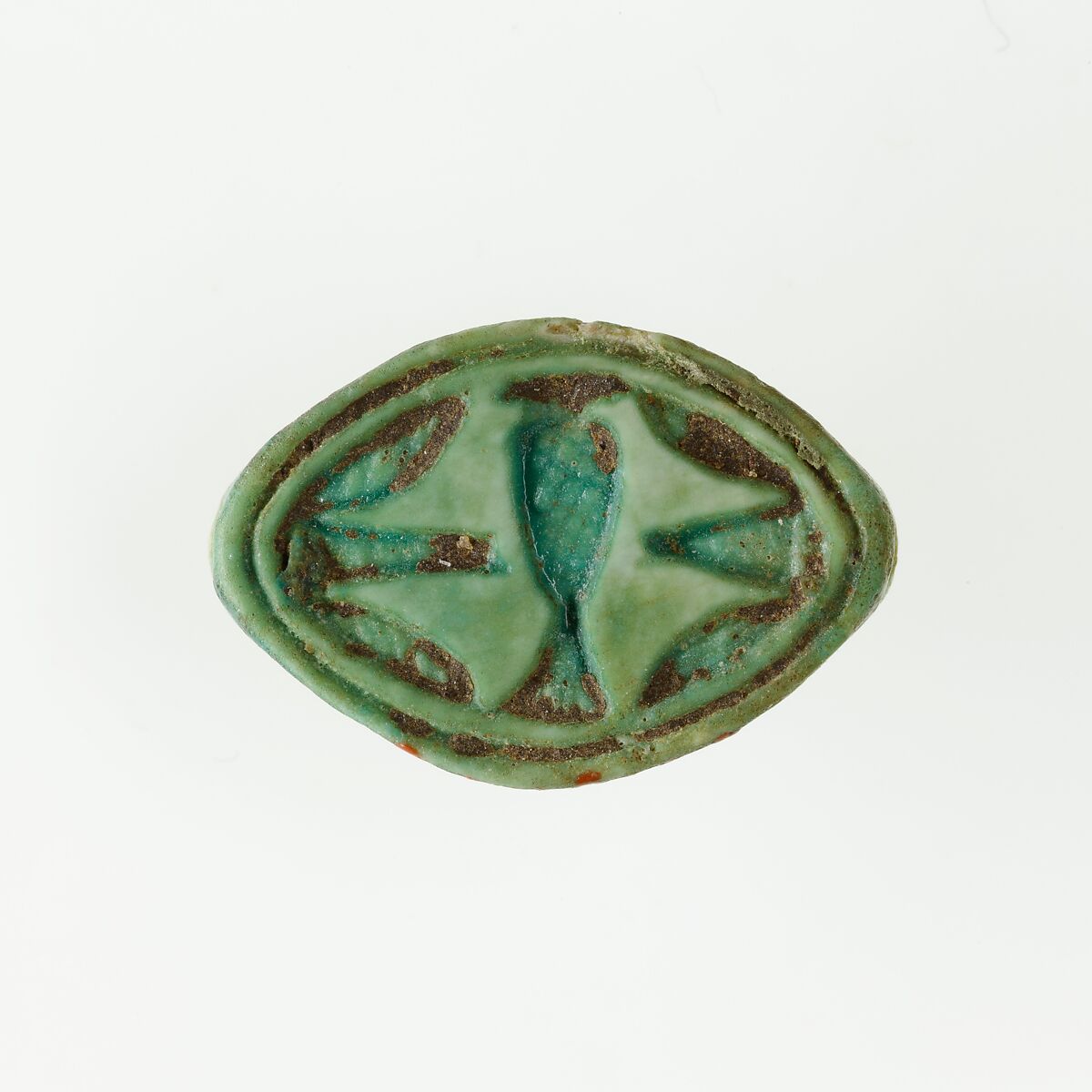 This cowrie-shaped seal-amulet was found with twenty-three scarabs and seal-amulets in the coffin of a young woman who was buried in Hatnefer's tomb (see 36.3.1 and 36.3 26). The base is inscribed with a hes-vase and what appeare to be two lotus blossoms.
