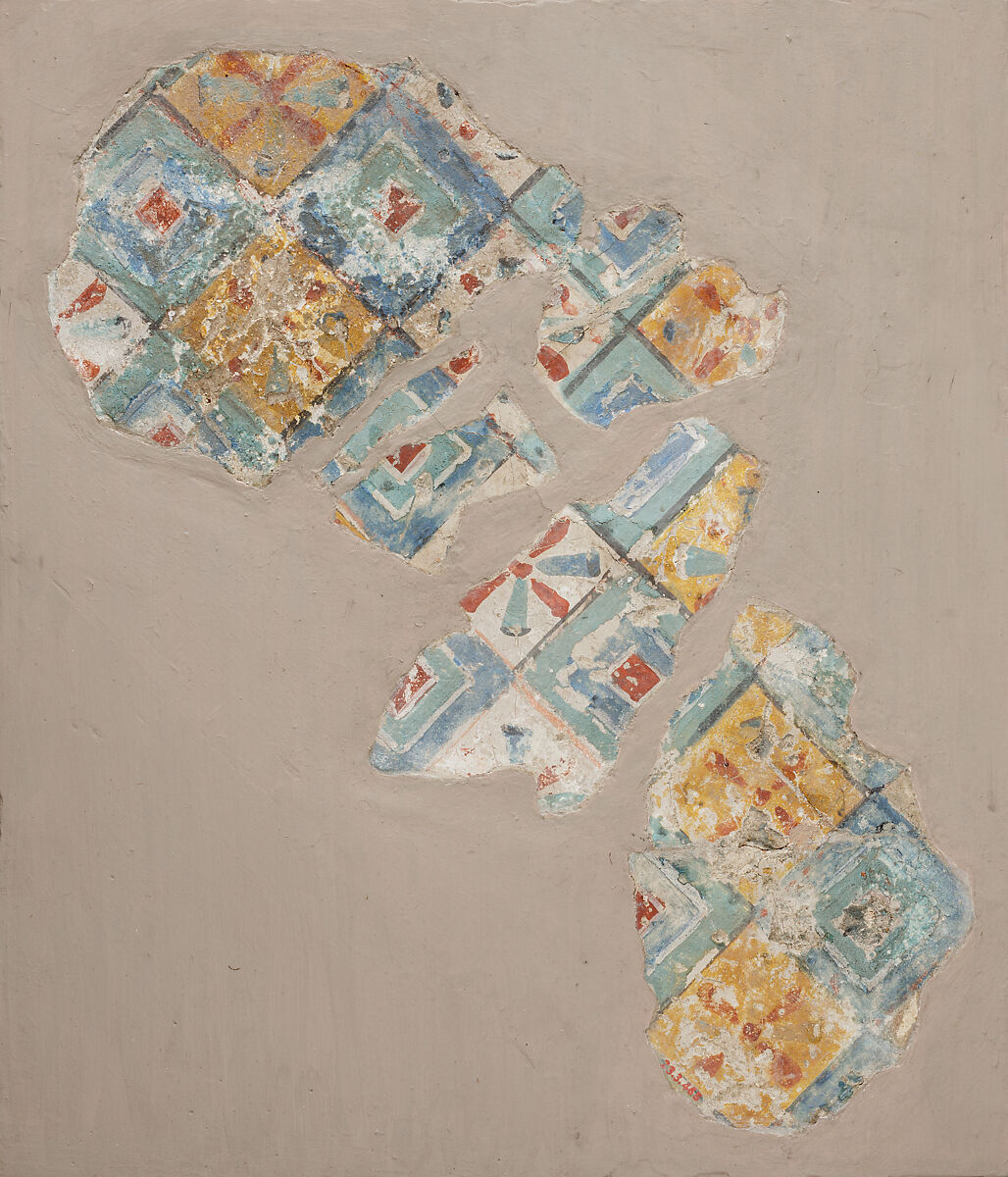 Senenmut's offering chapel consisted of two rooms forming a T. The chapel faces almost due east and the entrance leads into a broad, transverse hall extending to the right and left (north/south). The long axial hall extends straight ahead (west). The ceilings of these two rooms were painted with a variety of geometric patterns and bands of text recording offering prayers and the name and titles of Senenmut. At the end of the excavation season, the Museum was awarded several pieces of the painted ceiling plaster. This fragment came from the south side of the transverse hall (the first room).