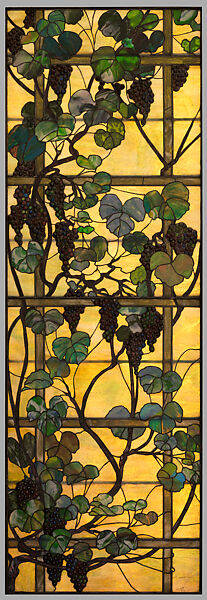 These highly decorative panels (see also 1978.19.1) feature lush grapes and vines entwined on a rectilinear trellis. The broad leaves are rendered in a wide variety of greens touched with blue, purple, and even pink. The slender—vines--some lead, some glass--twist themselves around the trellis, while the rounded, three-dimensional forms of the grapes further enhance the illusionistic effect. In another hallmark of Tiffany windows, the leading is of varying thickness; the grapevines are delicate and fluid, while thicker, more uniform leading conveys the rigidity of the trellis.